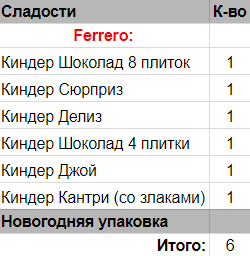 Киндер Сюрприз (1 шт), Киндер Шоколад 4 плитки (1 шт), Киндер Кантри (со злаками) (1 шт), Киндер Джой (1 шт), Киндер Шоколад 8 плиток (1 шт), Киндер Делиз (1 шт)