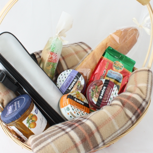 Состав: корзина, термос, 3 паштета, аэрозоль от комаров, конфитюр, семечки, хлеб, плед, поздравление.