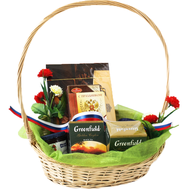 Состав: корзина, конфеты, 2 чая Гринфилд, 2 конфитюра, тортик, открытка, цветы иск